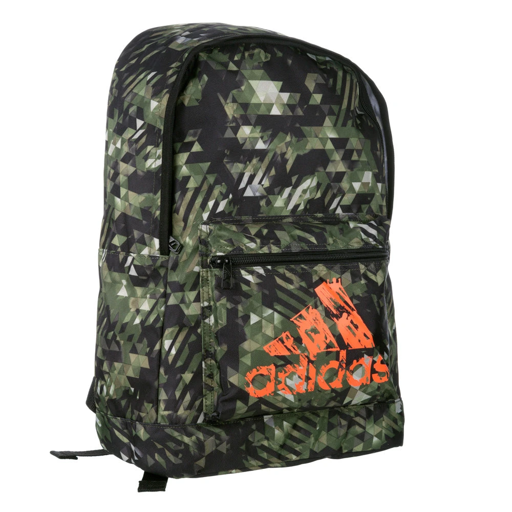 These Adidas camoflague backpack features adjustable straps, a front pocket, and one main large compartment with slide in pocket, and the three stripe logo on the front. The front compartment contains small pockets for storing accessories.