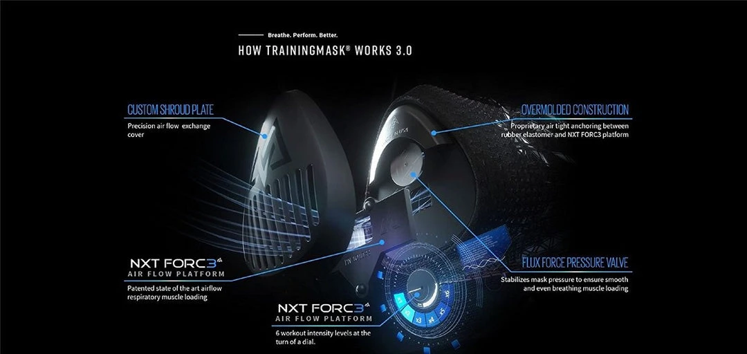 TrainingMask 3.0 is powered by the revolutionary NXT FORC3 air flow platform which was precision crafted to apply variable levels of load to the respiratory muscles via dial-able air flow adjustment. Performance breathing with the TrainingMask 3.0 makes your respiratory muscles stronger and more efficient; this gives you access to unparalleled workout stamina, endurance, and recovery. Defeat training fatigue and stay stronger longer with the TrainingMask 3.0 .Â