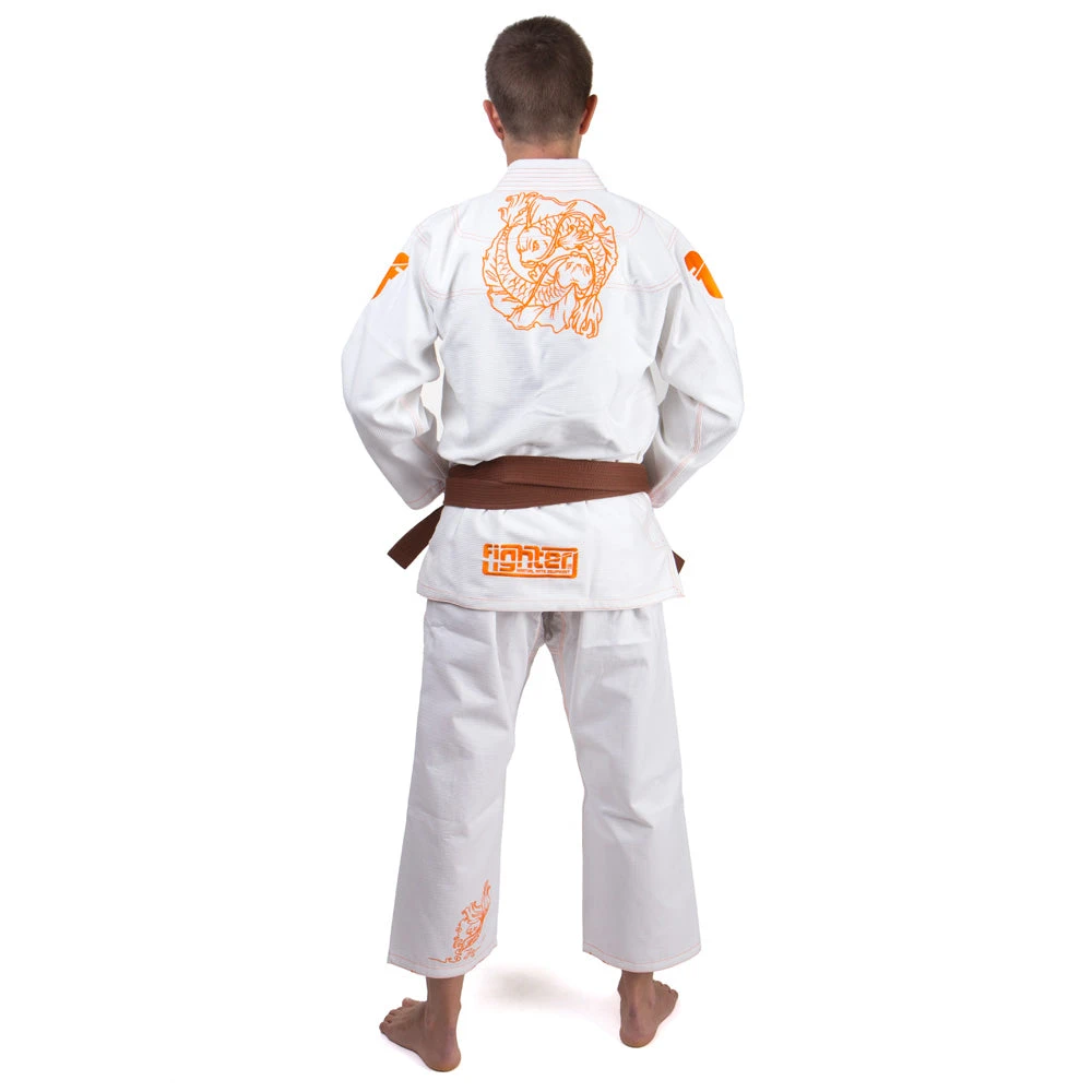 This Fighter BJJ Gi modern model blends fabrics differently for the top and bottom. The top is a made of a one-piece, traditionally thicker, durable, cotton fabric with a a densely woven 450 gsm Pearl Weave. It has softer inside lining made of polyester to reducing chaffing.