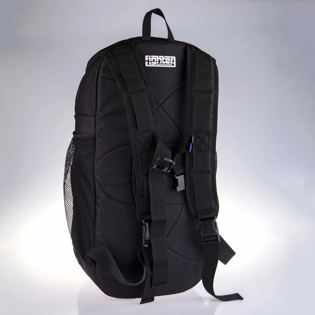 The Fighter backpack is made of a firm, anti-abrasion specially fabricated material. The backpack is composed of a main spacious pocket that is approximately 25 L large, and a front pocket, which holds up to 5 l of material, and on the side of the backpack are two pockets designed specifically for bottles of beverages. These large side pockets take up to 1.5 L bottles.